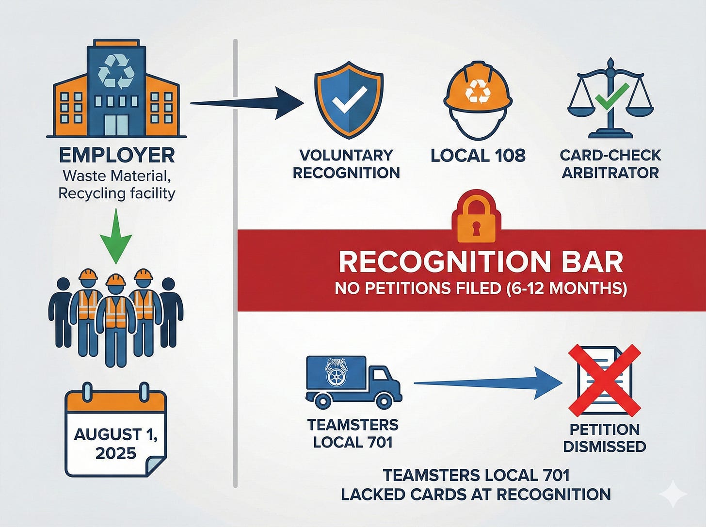 The NLRB Regional Director dismissed a representation petition filed by Teamsters Local 701 based on the recognition-bar doctrine. The Employer had voluntarily recognized Waste Material, Recycling and General Industrial Laborers’ Local 108 on August 1, 2025, following a card-check process overseen by an arbitrator. At the time of recognition, Local 108 was the only union actively organizing employees, and Teamsters Local 701 did not obtain authorization cards from employees until after the Employer had already recognized Local 108.