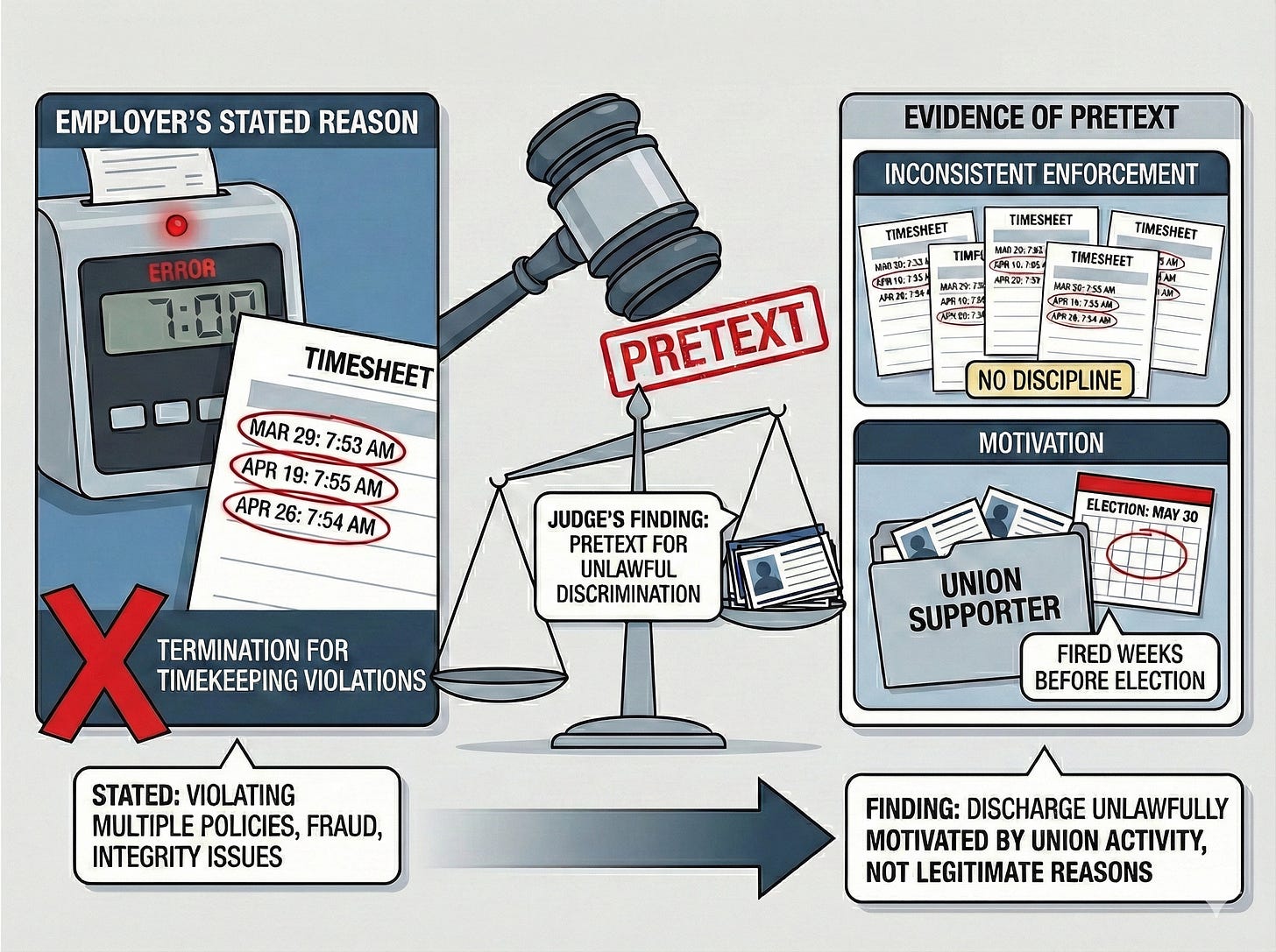The judge found this justification pretextual. Evidence showed that irregular time punches were commonplace under prior management, with numerous employees clocking in early or late without consistent enforcement. REI’s own attendance policy required four infractions within four weeks to trigger discipline, yet Hamlin was terminated for three minor discrepancies. Moreover, the purported “falsification” relied on comparing Hamlin’s handwritten times to CCTV timestamps, with differences of only minutes and no evidence the systems were synchronized. The judge concluded REI failed to establish Hamlin acted with intent to defraud.