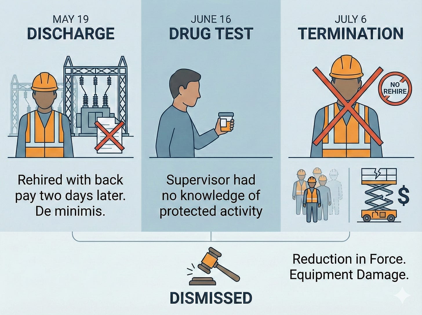 For the July 6 termination, the judge ruled the company met its burden under Wright Line by showing Stafford would have been laid off regardless of protected activity. The decision cited both a legitimate reduction in force affecting multiple electricians and Stafford’s responsibility for a workplace accident where he operated lift equipment without certification, causing $5,000-$9,999 in damage. The judge noted Stafford’s earlier refusal to return his security badge to Metro officials after a 2022 termination also justified denying reinstatement.