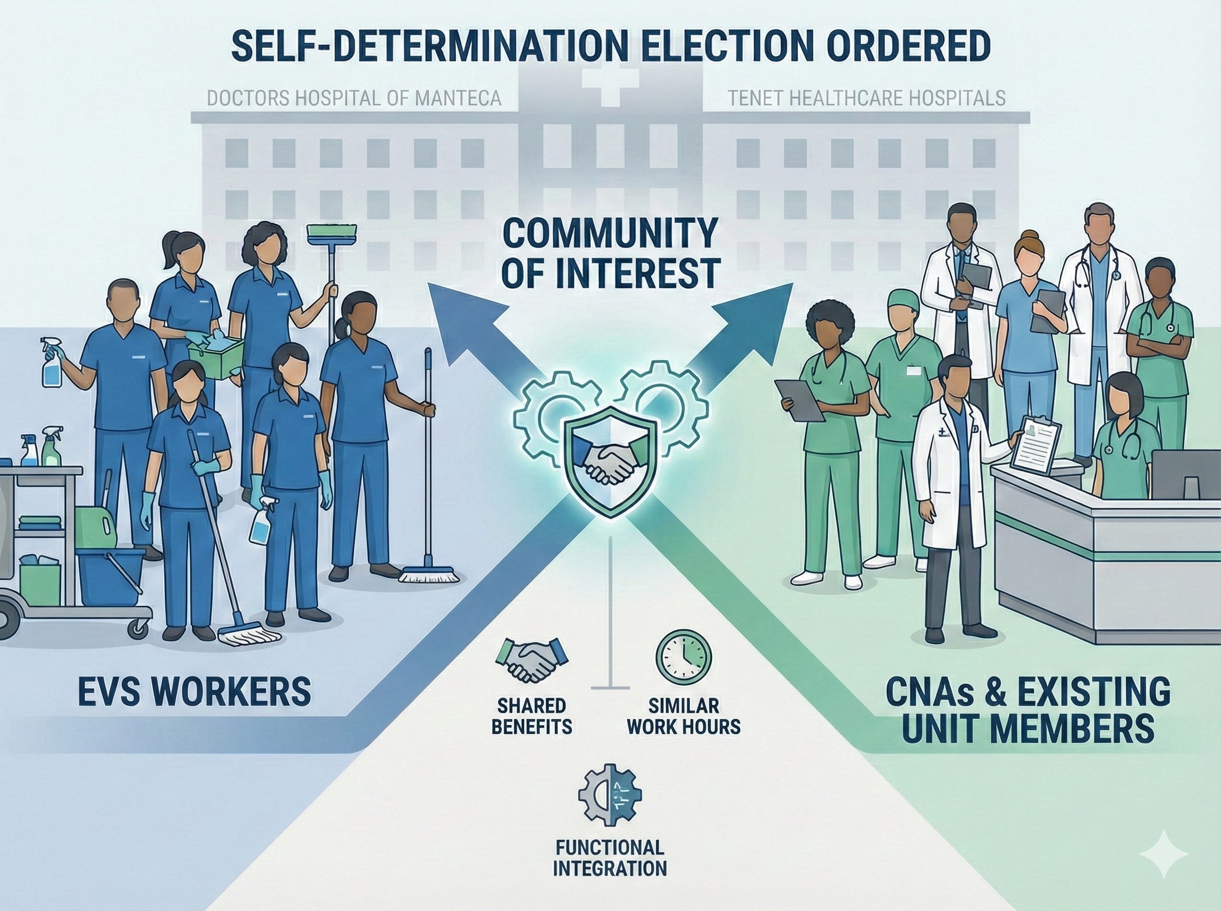 The NLRB Regional Director approved a self-determination election to allow approximately 28 environmental services (EVS) workers at Doctors Hospital of Manteca to vote on joining an existing multi-facility bargaining unit represented by SEIU-UHW that already covers employees across seven Tenet Healthcare hospitals in California.