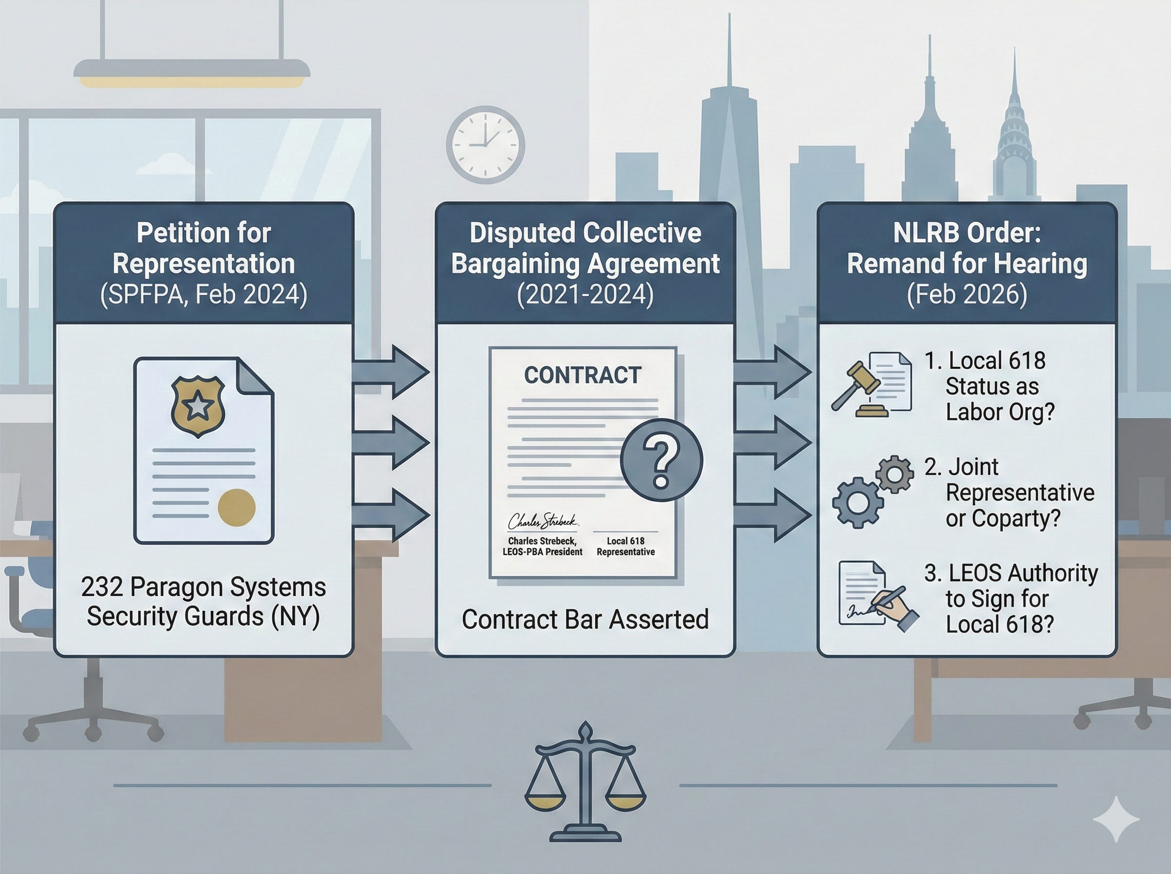 The Board granted review in February 2026, identifying three questions requiring hearing development. First, whether Local 618 is a labor organization under Section 2(5)—the Board found LEOS’s representations insufficient to resolve this question and noted SPFPA’s contrary evidence. Second, if Local 618 is a labor organization, whether it is a joint representative with LEOS (analyzed under Pharmaseal Laboratories) or a separate coparty (analyzed under Crothall Hospital Services). Third, what evidence exists concerning LEOS’s authority to sign on Local 618’s behalf, including course of conduct under Pharmaseal or agency/apparent authority under Crothall exceptions. Because LEOS bears the contract bar burden, the Board remanded for a hearing to develop the factual record.