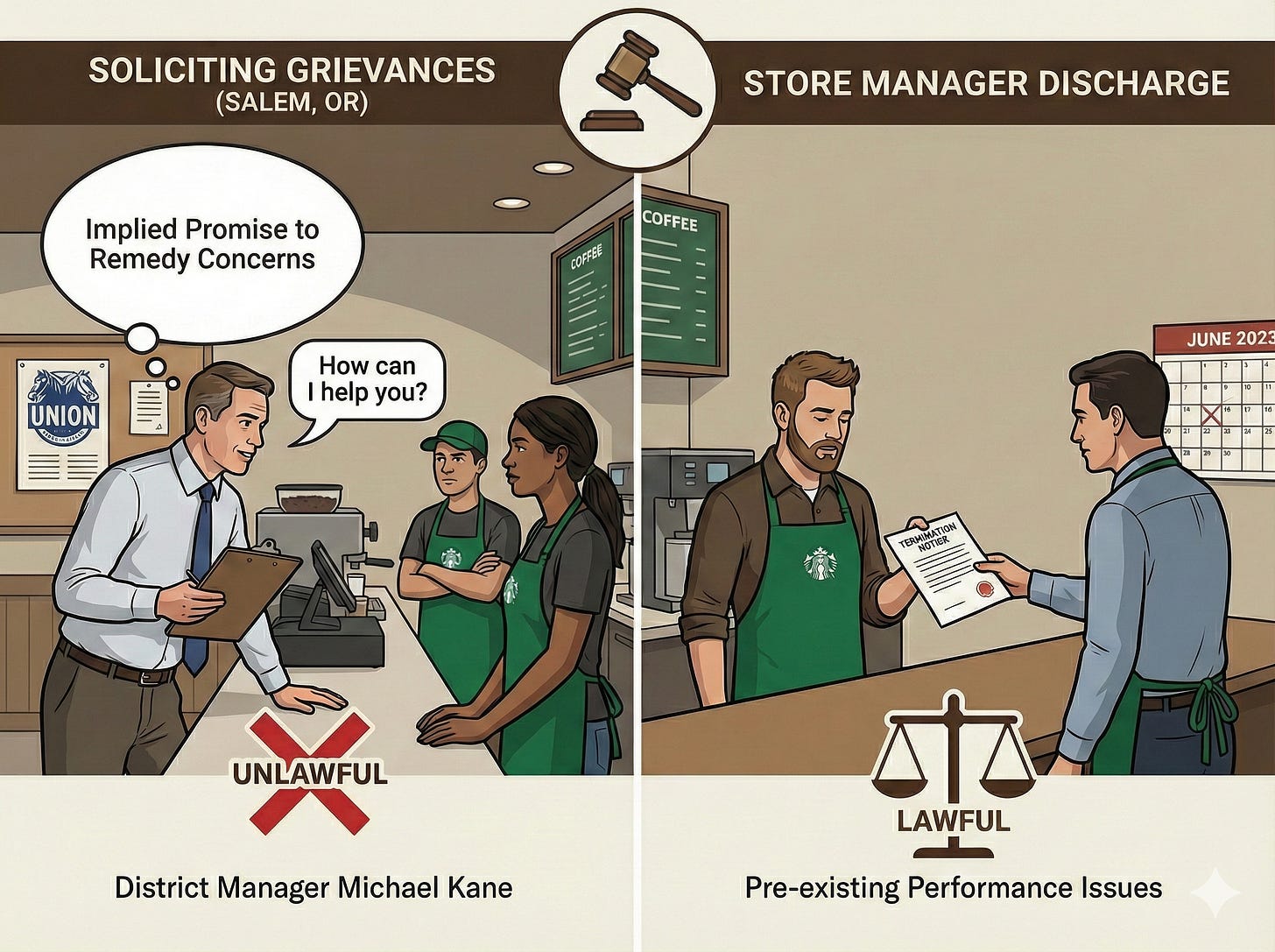An NLRB Administrative Law Judge found Starbucks violated the National Labor Relations Act when District Manager Michael Kane solicited grievances from employees at a Salem, Oregon store during a 2023 union campaign, impliedly promising to remedy workplace concerns. The judge ordered Starbucks to post notices but dismissed allegations that the company unlawfully fired Store Manager Wade Russell for refusing to commit unfair labor practices, finding the discharge would have occurred anyway due to pre-existing performance issues.