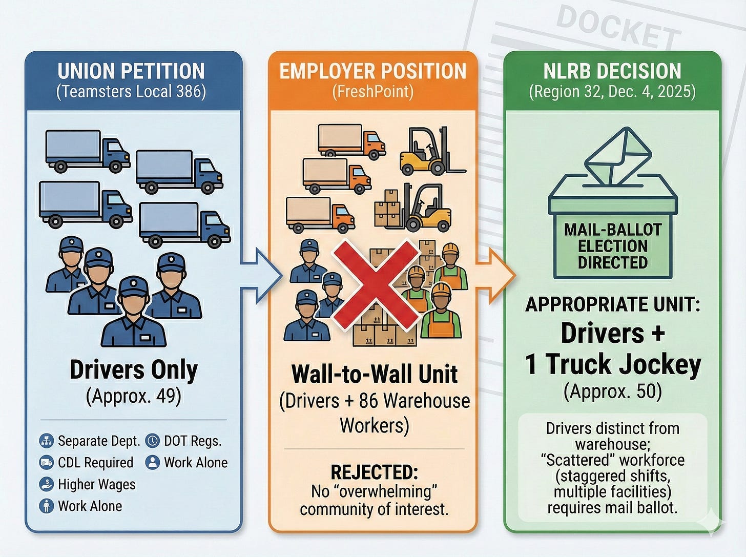 In a December 4, 2025 decision, NLRB Region 32 Director Christy Kwon directed a mail-ballot election for drivers at FreshPoint Central California, largely rejecting the employer’s attempt to expand the bargaining unit to include warehouse workers.