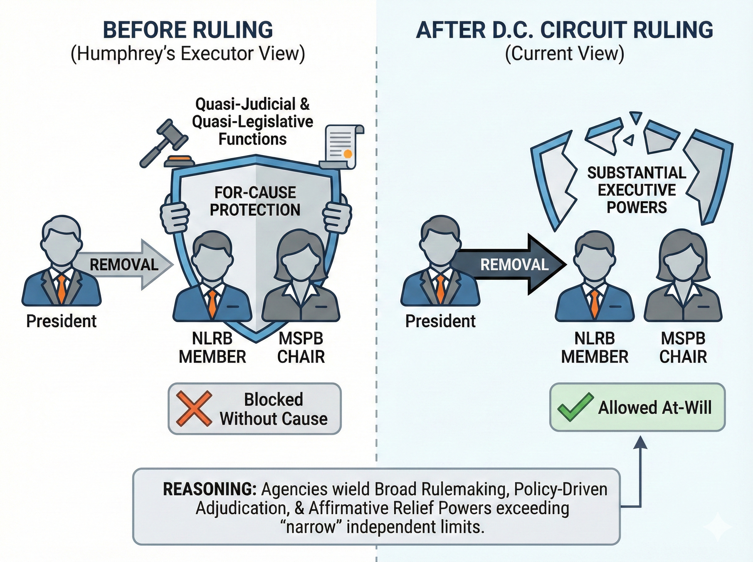 The D.C. Circuit has ruled that statutory for-cause removal protections for members of the National Labor Relations Board and Merit Systems Protection Board are unconstitutional, holding that these agencies wield substantial executive powers exceeding those deemed quasi-legislative or quasi-judicial under Humphrey’s Executor.