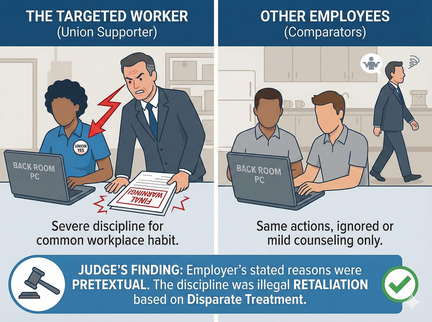 Judge Sarah Karpinen found the discipline was pretextual based on several factors. There was no established rule prohibiting employees from using time clock applications on back-room computers. Records showed numerous employees, including crew member Patterson who used the back laptop over 60 times, clocked in or out there without consequence. Management only instructed employees to stop using the back laptop after disciplining Smith.