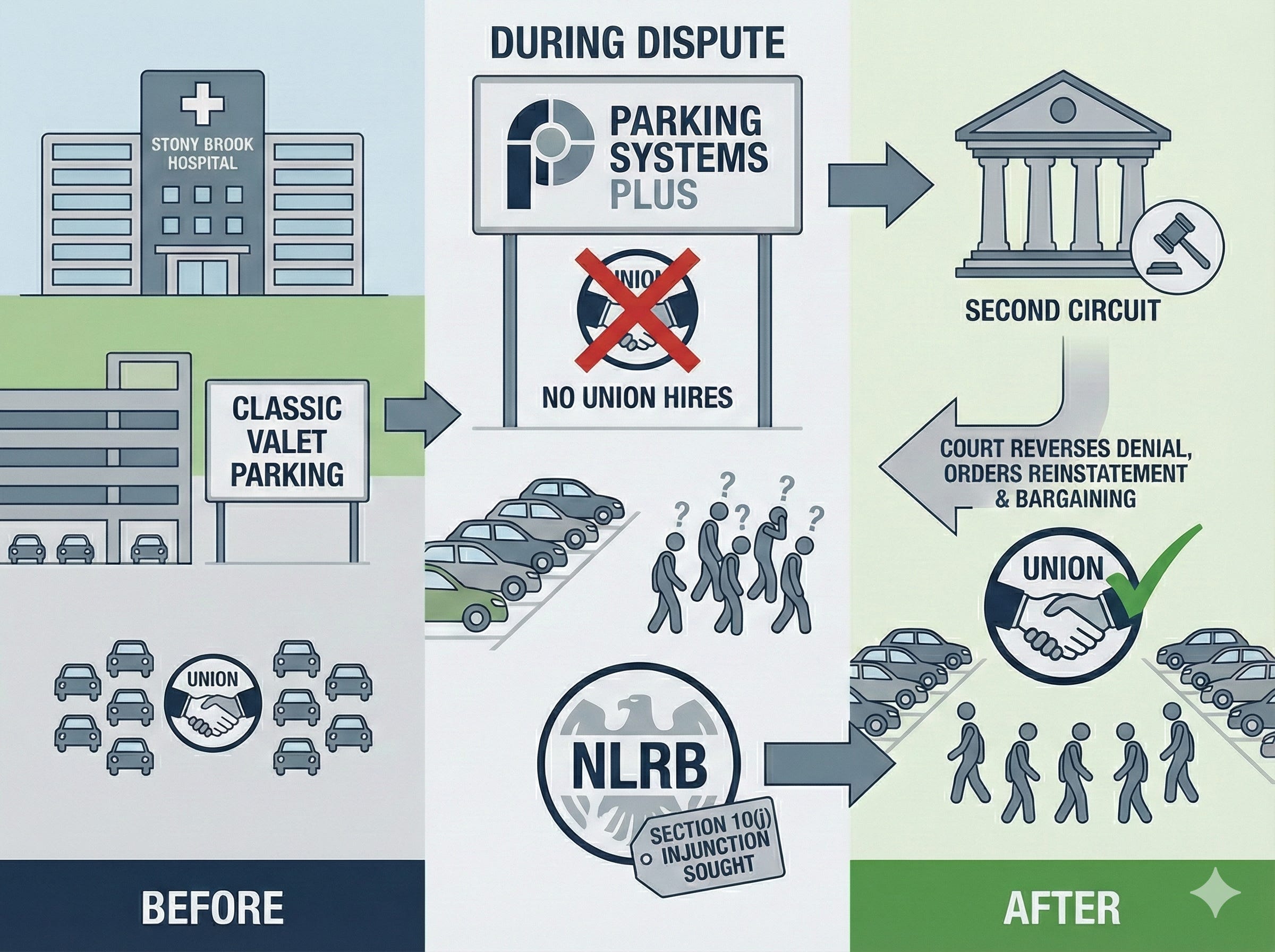 Parking Systems won a contract to provide valet parking at Stony Brook Hospital, replacing Classic Valet Parking, whose 34 employees were unionized. Initially, Parking Systems expressed interest in retaining Classic’s workers, but changed course after learning of their union status. Internal emails showed concerns about union wage rates, and the company hired none of the Classic employees despite posting urgent job openings. One employee testified that a company owner said Parking Systems wouldn’t hire the workers “because they worked with the Union.”