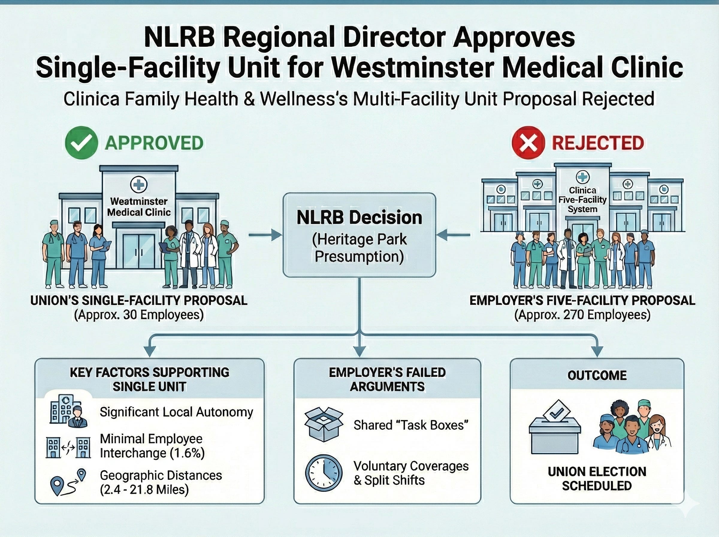 The NLRB Regional Director approved a union election for employees at Clinica Family Health & Wellness’s Westminster Medical Clinic, rejecting the employer’s attempt to require a larger five-facility bargaining unit. The case centered on whether approximately 30 employees at the Westminster location could vote separately, or whether they must be combined with roughly 240 employees from four other clinics.