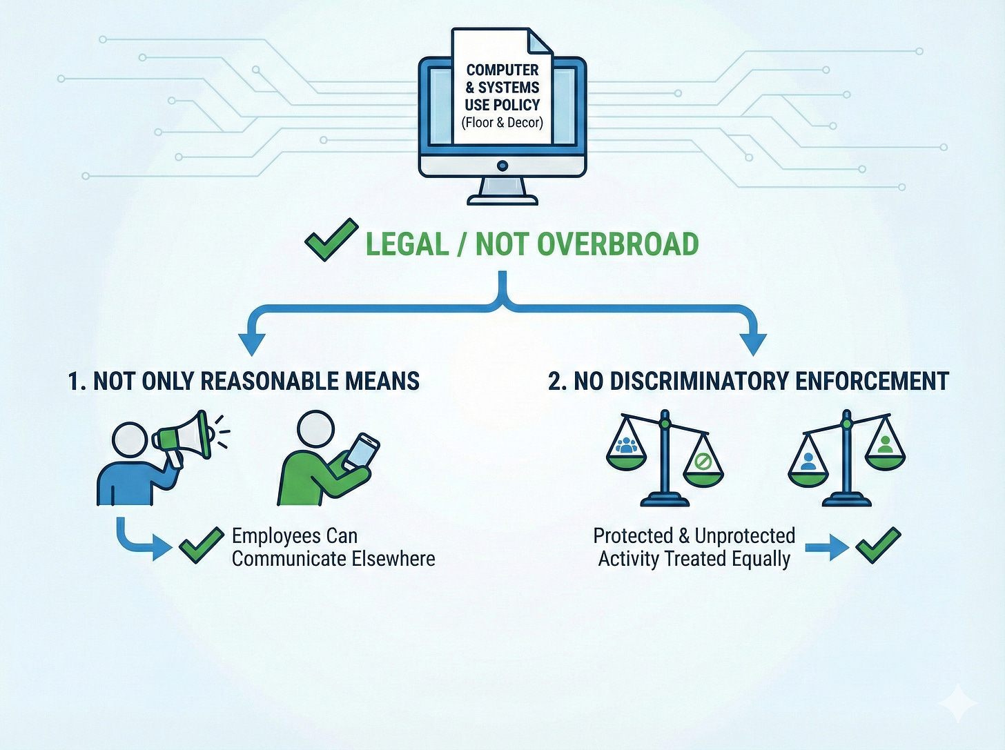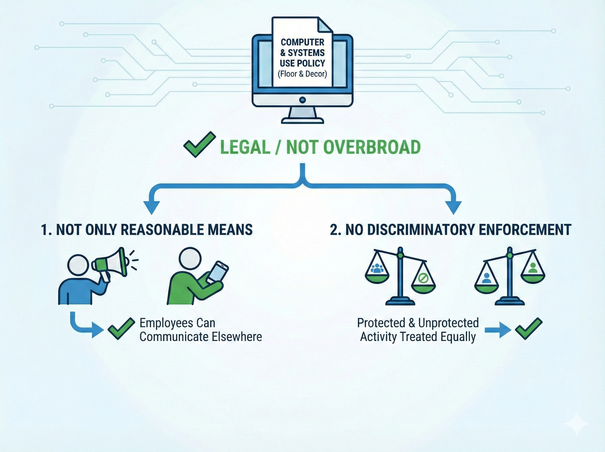 The legal analysis centered on established precedent governing employer IT systems. Under Rio All-Suites, employees generally have no Section 7 right to use their employer’s IT systems, and employers maintain property rights to control those systems. The Board recognizes only two narrow exceptions: when the employer’s system is the only reasonable means for employee communication, or when discriminatory enforcement is proven.