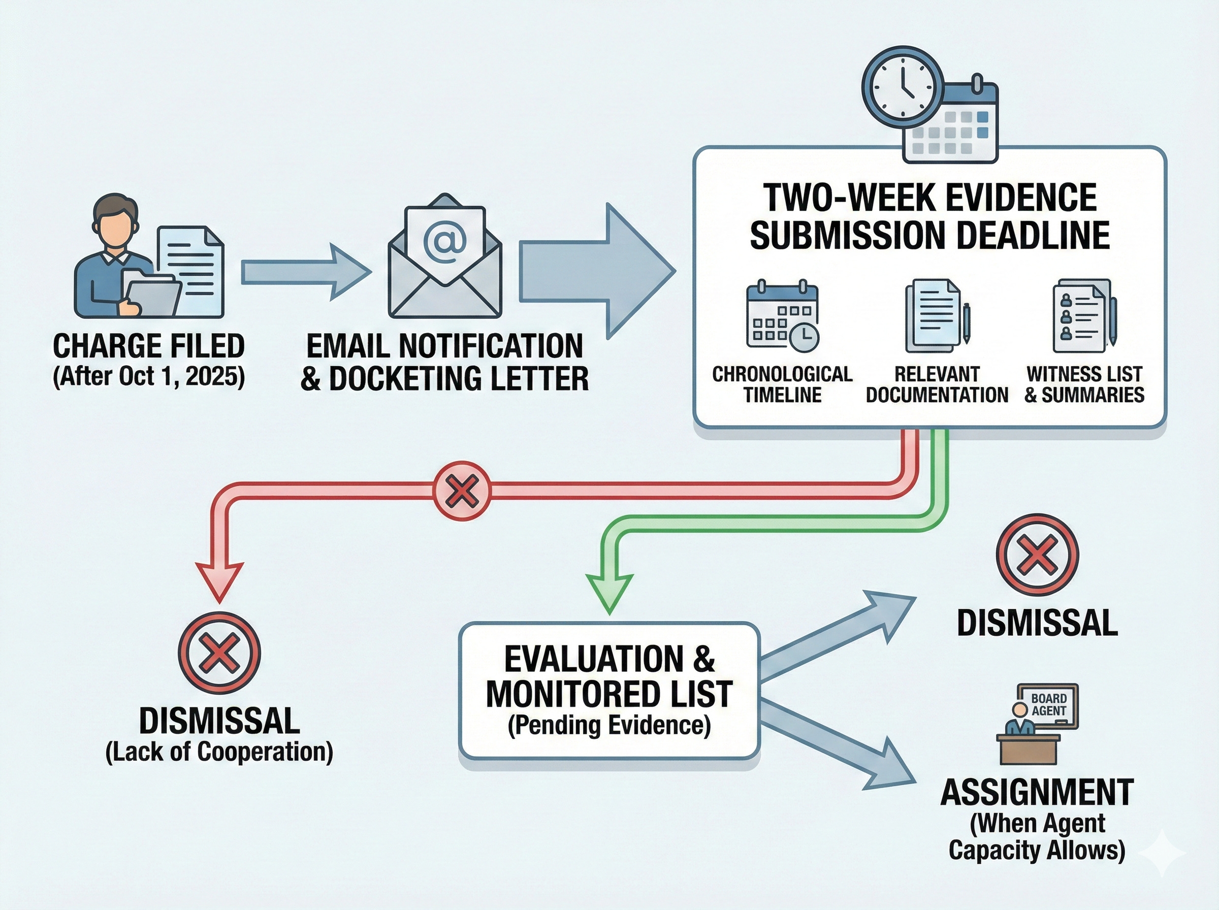 Under the new protocol, charging parties must submit substantial evidence within two weeks of filing. This includes a chronological timeline of events with names and titles of involved parties, all relevant documentation including communications, and a witness list with contact information and testimony summaries. Regional offices may substitute questionnaires for the timeline requirement. The docketing letter will be sent via email to ensure charging parties have adequate time to respond, and will include contact information for questions. Failure to provide requested evidence or respond by the deadline may result in charge dismissal for lack of cooperation.