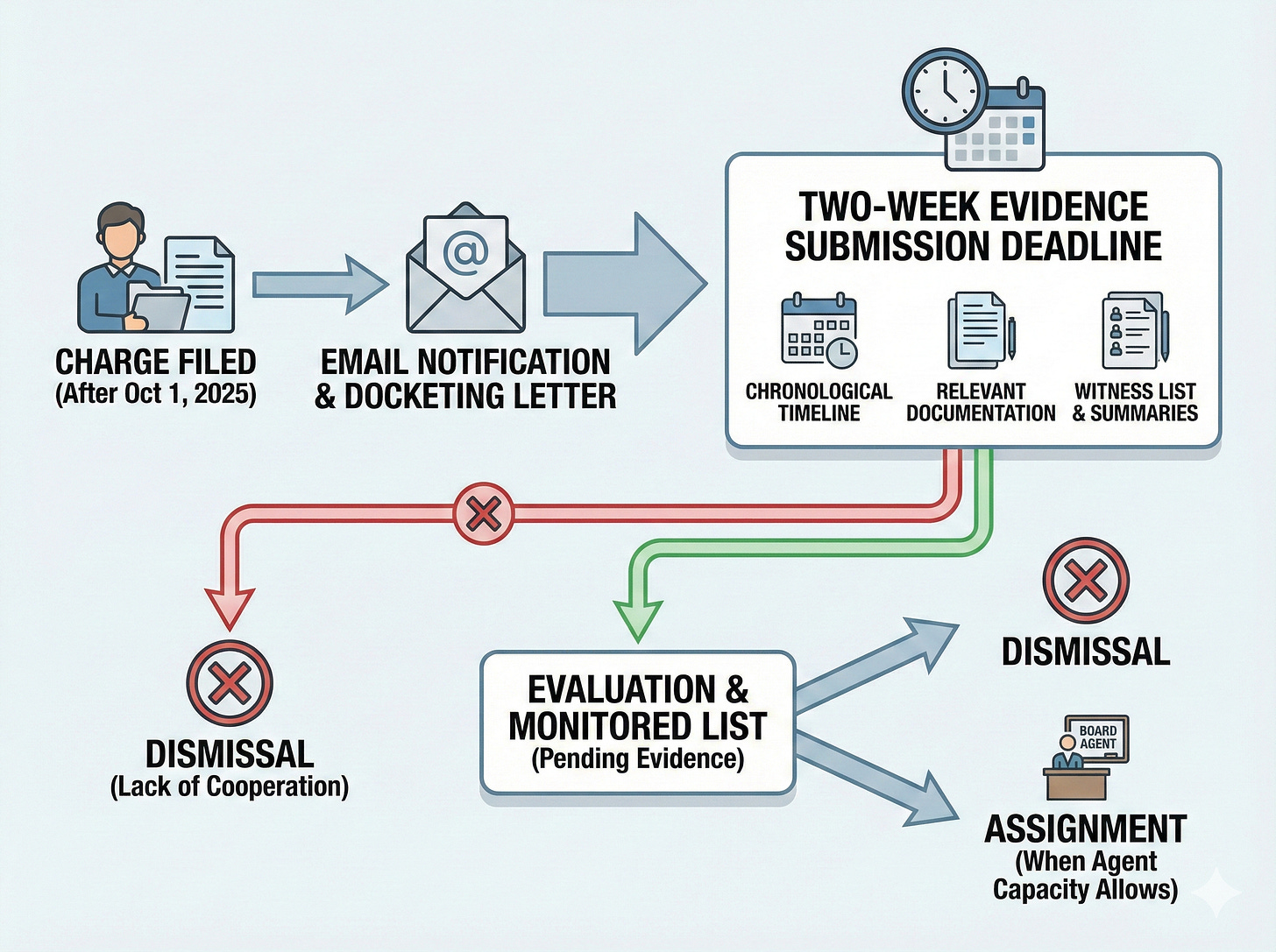 The new procedures significantly alter case assignment practices. Most charges—excluding statutory priority matters and those related to existing cases—will not be immediately assigned to a Board agent upon filing. Instead, charges will remain on a monitored list pending the charging party’s initial evidence submission. After submission and evaluation, the region determines whether assignment or dismissal is appropriate. Even charges deemed suitable for investigation will only be assigned when a Board agent has sufficient capacity for timely investigation; otherwise, they remain unassigned until capacity becomes available.