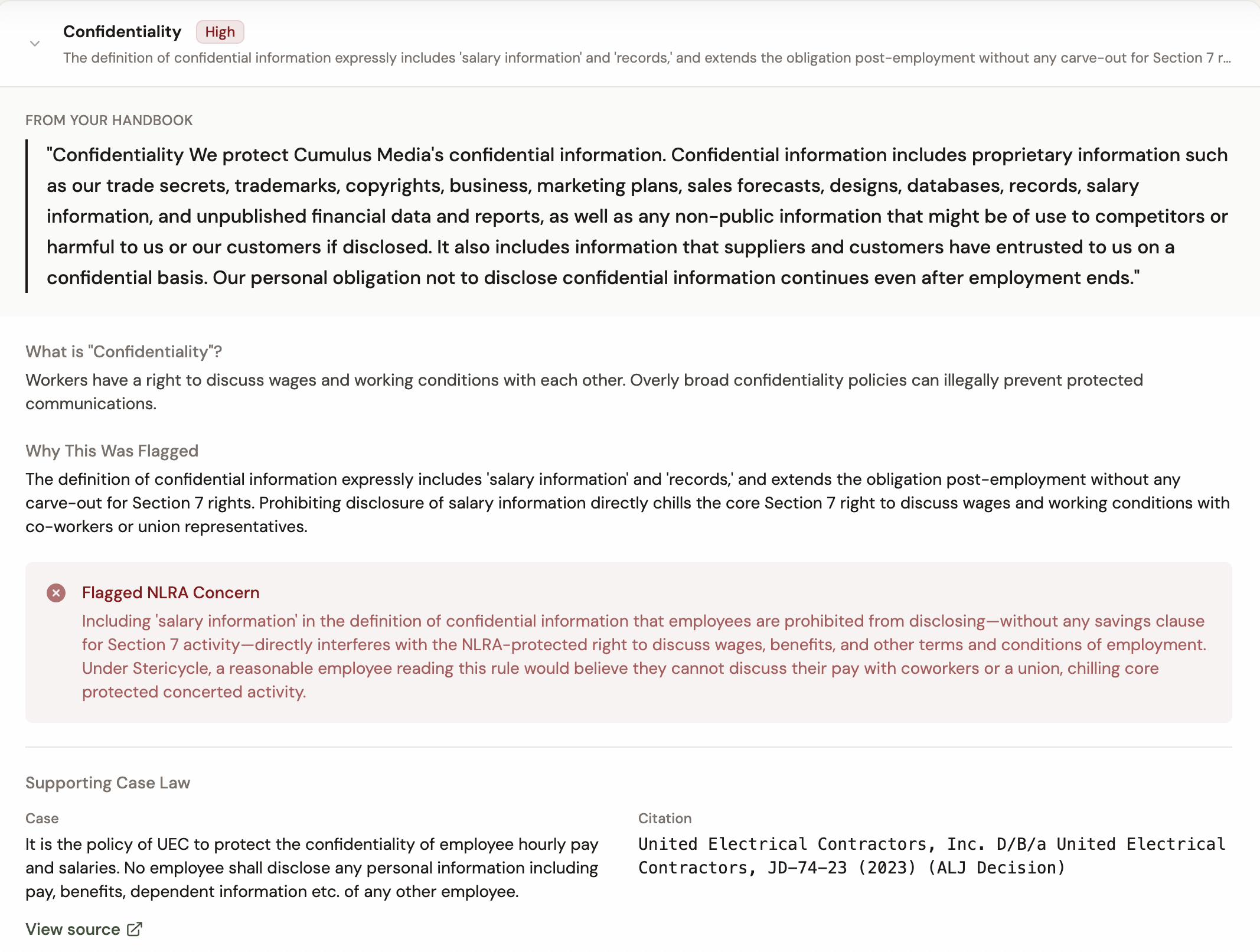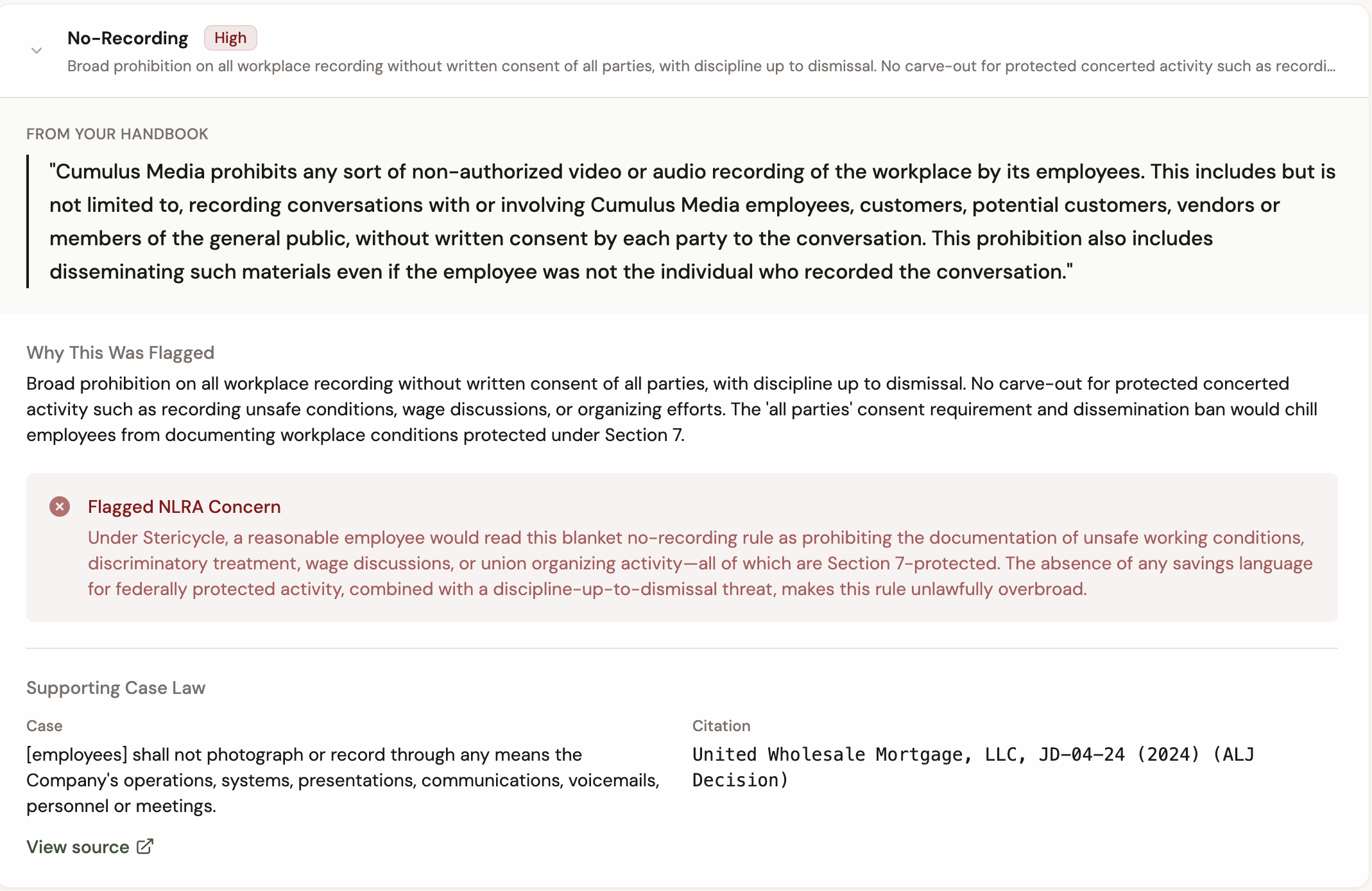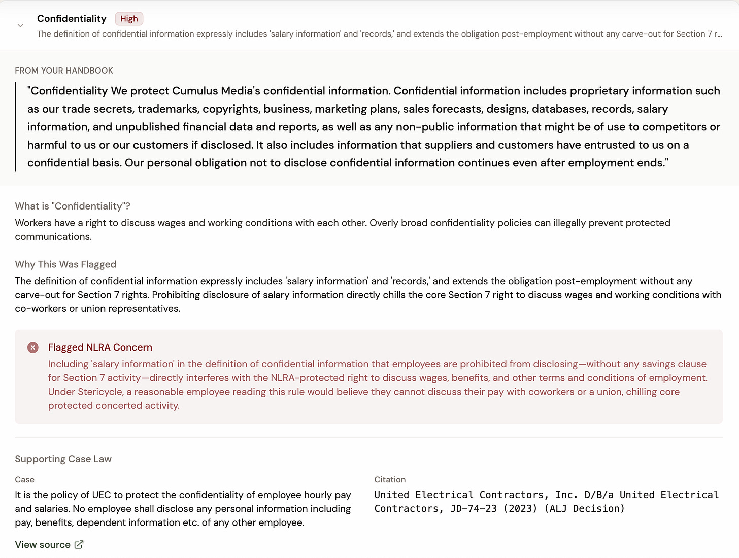 For example, it flagged these two rules — a no-recording rule and a confidentiality rule — from an old Cumulus Media handbook as potential violations of the NLRA.