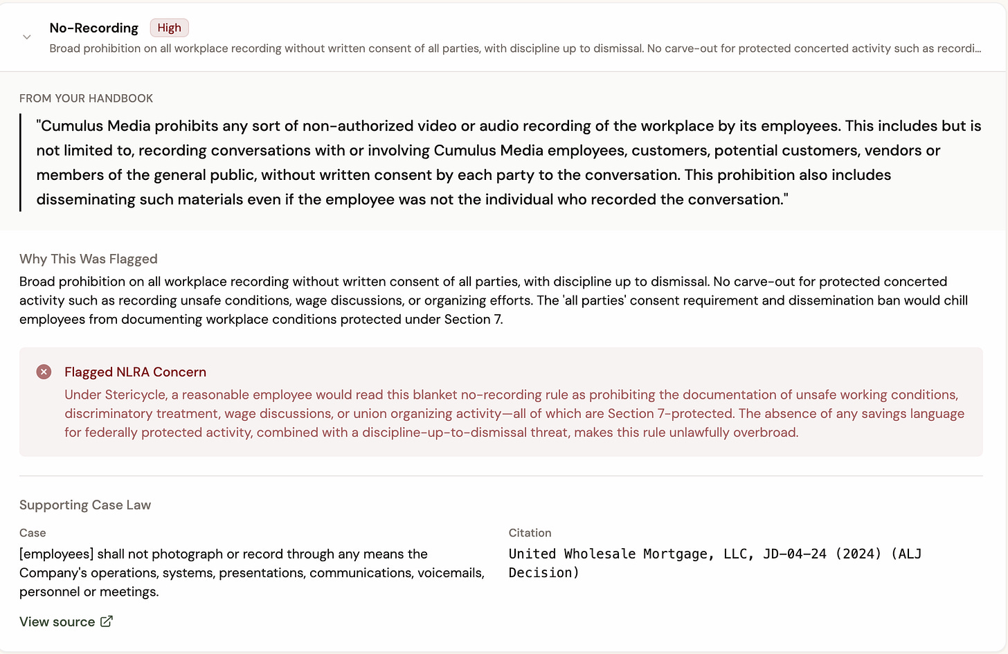 I did not make the website but I did help with the underlying inputs for it. In order to produce these inputs, I used the NLRB Law database at NLRBResearch.com to grab all of the ALJ Decisions and Published Board Decisions that cite to Stericycle. Each of those decisions were fed to a large language model with the instruction to pull out the exact text of every rule analyzed, to determine whether the decision found that the rule violated the NLRA or not, and then to provide a brief summary of the reasoning used by the ALJ or Board for its conclusion. All of that information is contained on this page of the CheckMyHandbook.com website.