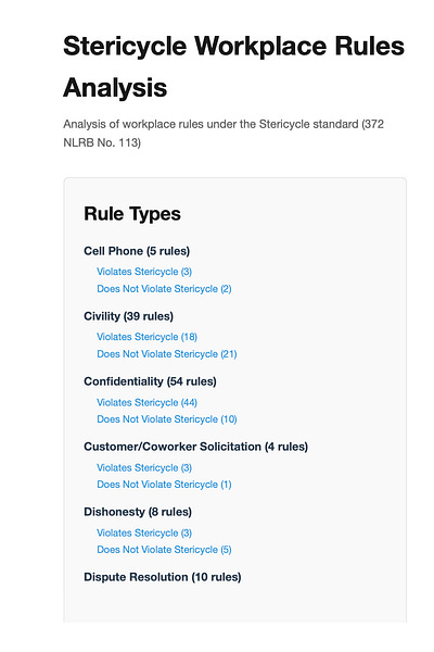 Over the weekend, I used Claude Code and Google Gemini to go through these decisions, pull out the exact text of any rule that was analyzed, determine whether the rule was held to violate the NLRA or not, and then provide a one sentence summary of the reasoning the judge used to reach their conclusion. I also used the LLMs to create rule categories — sixteen in total — and to assign each of the rules to a specific category. I reviewed the results and made a few changes to the LLM output.