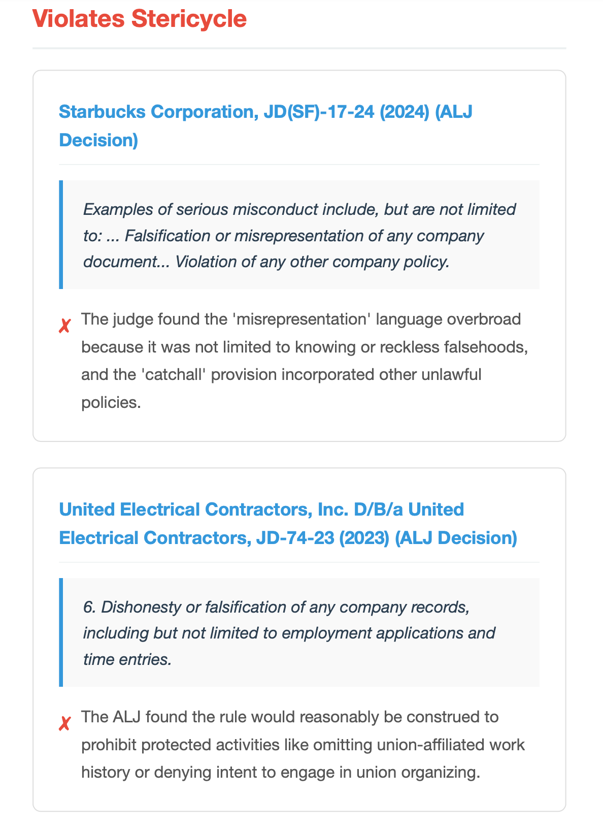 All 204 rules were sorted into one of the sixteen rule types and then further sorted into violating and non-violating rules. The table of contents makes it easy to jump to a specific rule type in the document and see all the rules that have been analyzed of that type. Each rule is neatly displayed in a card format featuring the case citation, rule text, and reasoning. If you click the citation, it will take you to that case in the NLRB Law database. See below for an example.