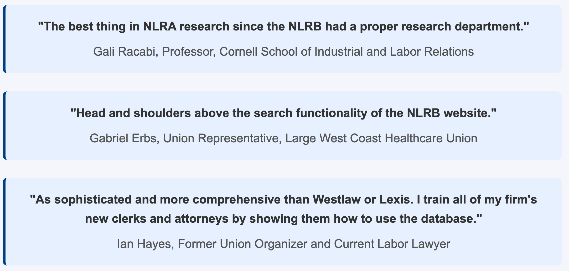 When it comes to labor law, NLRB Research should be of value to legal professionals and academics as well as rank-and-file workers and union representatives. The latter group, union representatives, should find it especially useful as their job often requires them to confront legal issues without having access to any legal research resources.