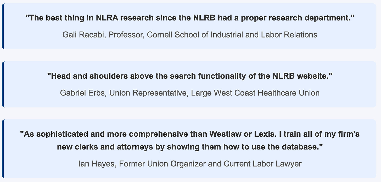 Over the last year, I constructed a self-updating comprehensive database for researching legal questions related to the National Labor Relations Act. For the last six months, over 100 testers — including academics, labor lawyers, union representatives, and rank-and-file workers — have been using the database and providing feedback about how to make it better. Over that period, the database has successfully updated itself every day without failure.