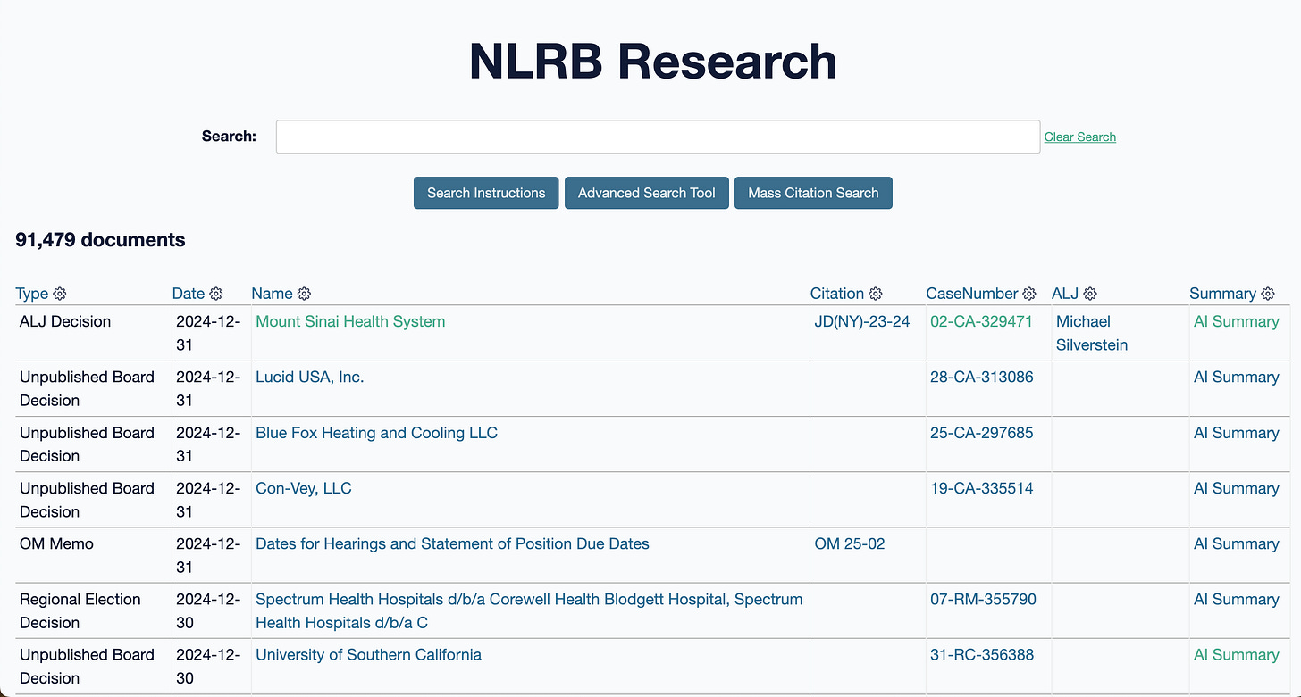 A user looking for guidance on a specific topic might find that their search matches a Supreme Court decision, a dozen NLRB decisions, a couple of advice memos, and the NLRB casehandling manual – all from a single query. The database contains the full text of each document as well as an AI-generated summary of each document.