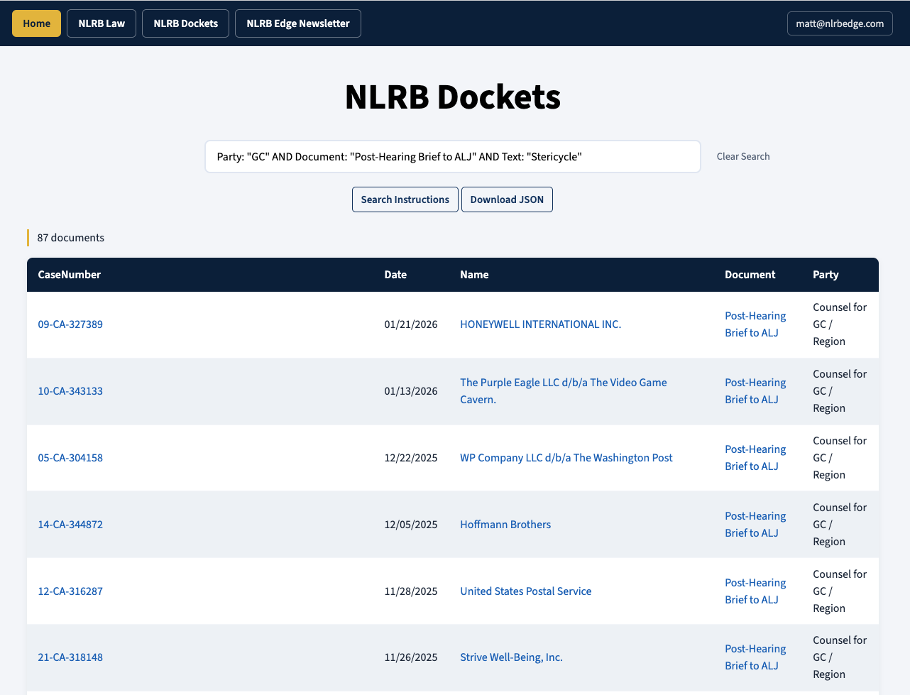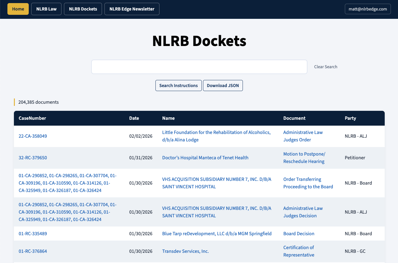 The NLRB Dockets database updates itself once a day by grabbing any new documents added to any NLRB docket. All of the documents in NLRB Dockets have been converted into plain text and are full-text searchable using the same query logic as NLRB Law.