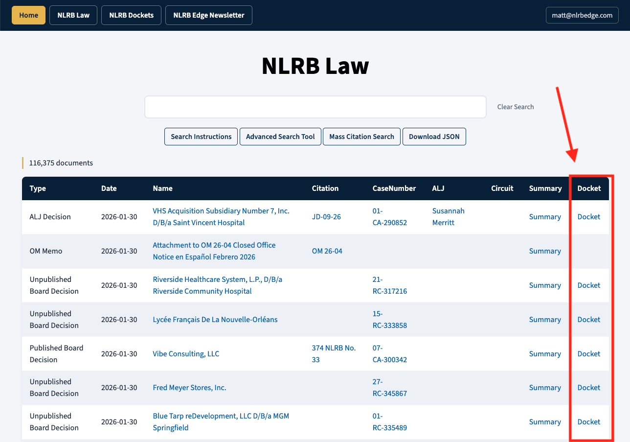 The NLRB Law database has also been updated to include a new Docket column. If you click that column it will execute a search for the Case Number in the NLRB Dockets database and thus pull up any documents on that Docket.